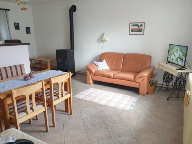 konvice, toustovač, topinkovač, vysavač, klasický TV, vaření: kombinovaný sporák s elektrickou troubou, el. plotýnek: 4, typ vytápění: elektrika + tuhá paliva lokální (obsluhuje host), (kamna na dřevo v kuchyni a 1 přenosný přímotop.), Ohřev vody: elektrický bojler (objem: 60 l), domácí zvíře: za poplatek (300 Kč.), možnost kouření: ne |