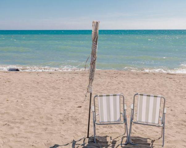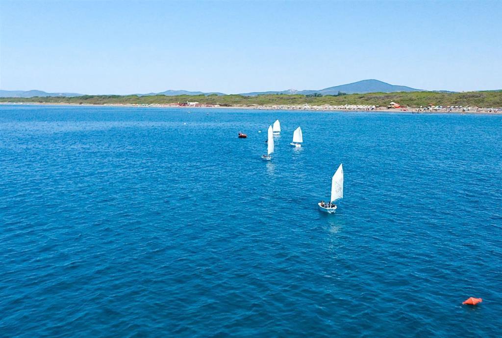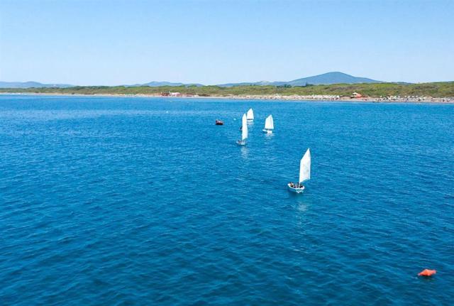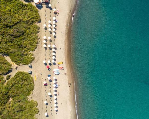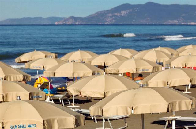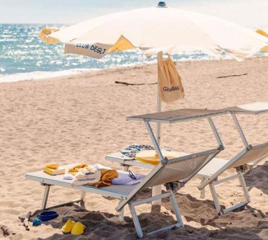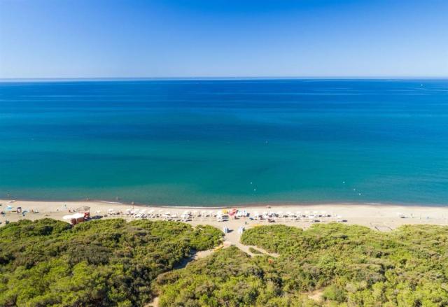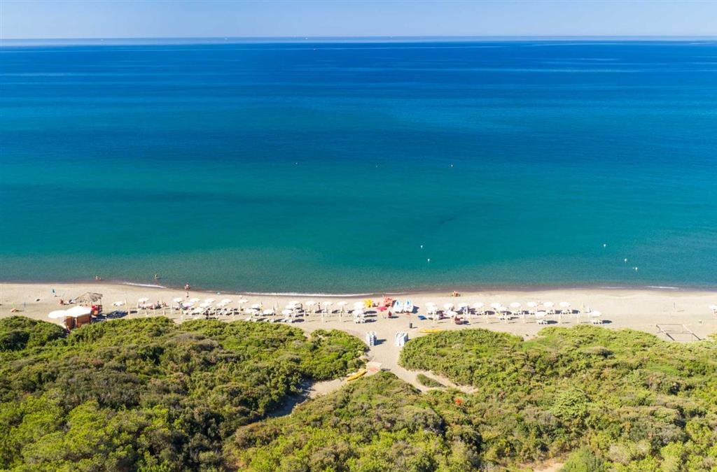 Písečná pláž je oddělena od villaggia piniovým hájem cca 150 m od ubytování. Plážový servis k dispozici zdarma (1× slunečník a 2× lehátko/apt.) v závislosti na počasí od cca 1. 6. K dispozici také psí pláž.