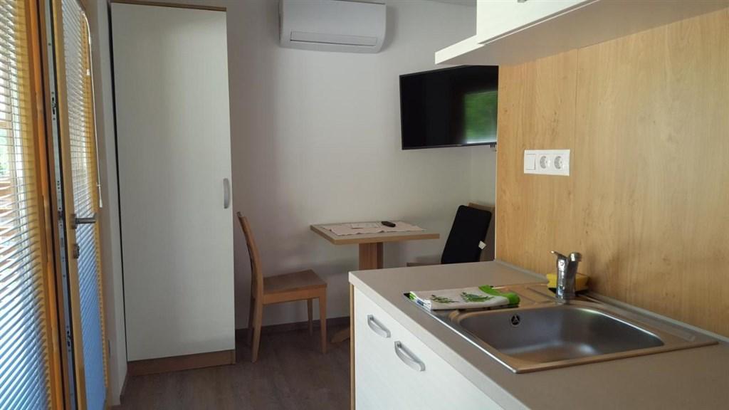 SMALL pro 2 osoby - ložnice, obývací část, vybavený kuchyňský kout,