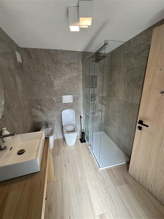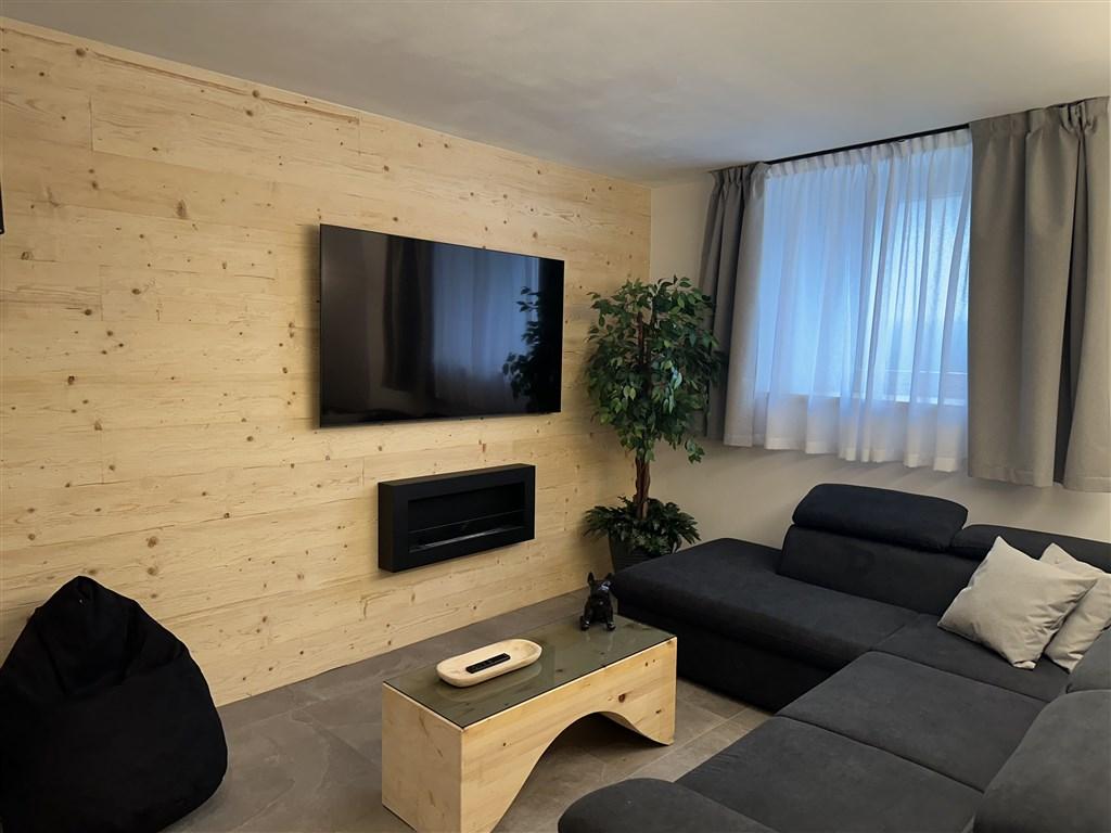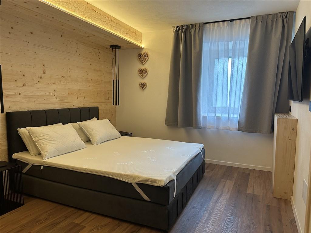 Bilo 4 Tramonto - přízemí: 1 ložnice s manželskou postelí, obývací pokoj s rozkládacím gaučem pro 2 osoby, kuchyňský kout a sociální zařízení. Součástí apartmánu je soukromé wellness se saunou a tureckou lázní.