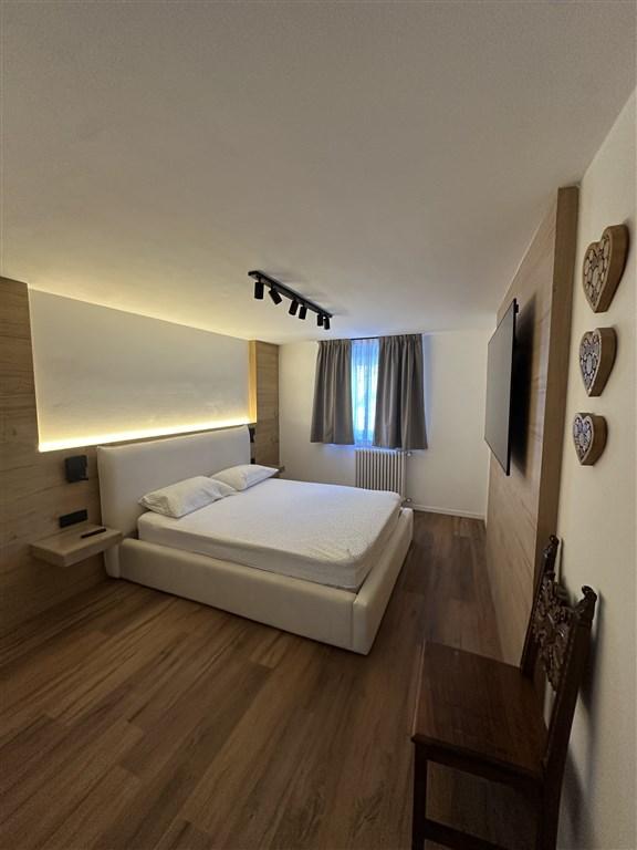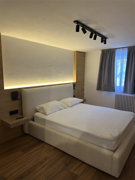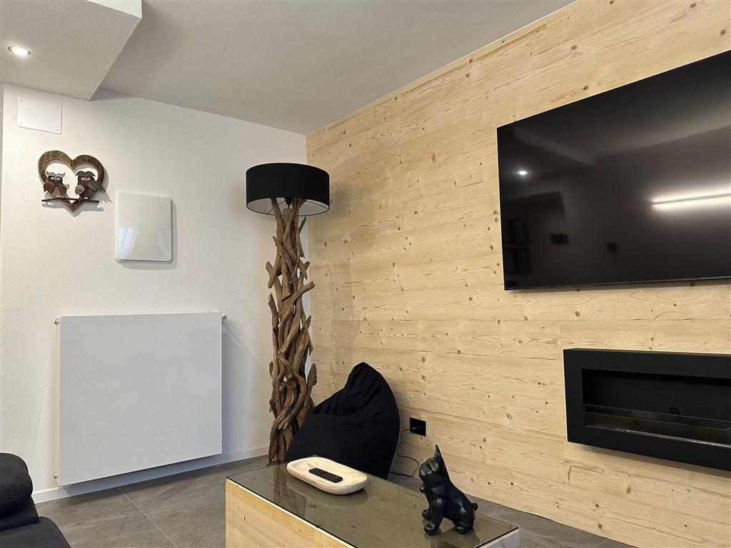 Bilo 4 Sole - 2.patro: světlý a prostorný apartmán s 1 ložnicí s manželskou postelí, obývací pokoj s kuchyňským koutem a rozkládacím gaučem pro 2 osoby, sociální zařízení, 2x terasa. Kombinuje teplo modřínového dřeva s moderní technologií a pohodlím.