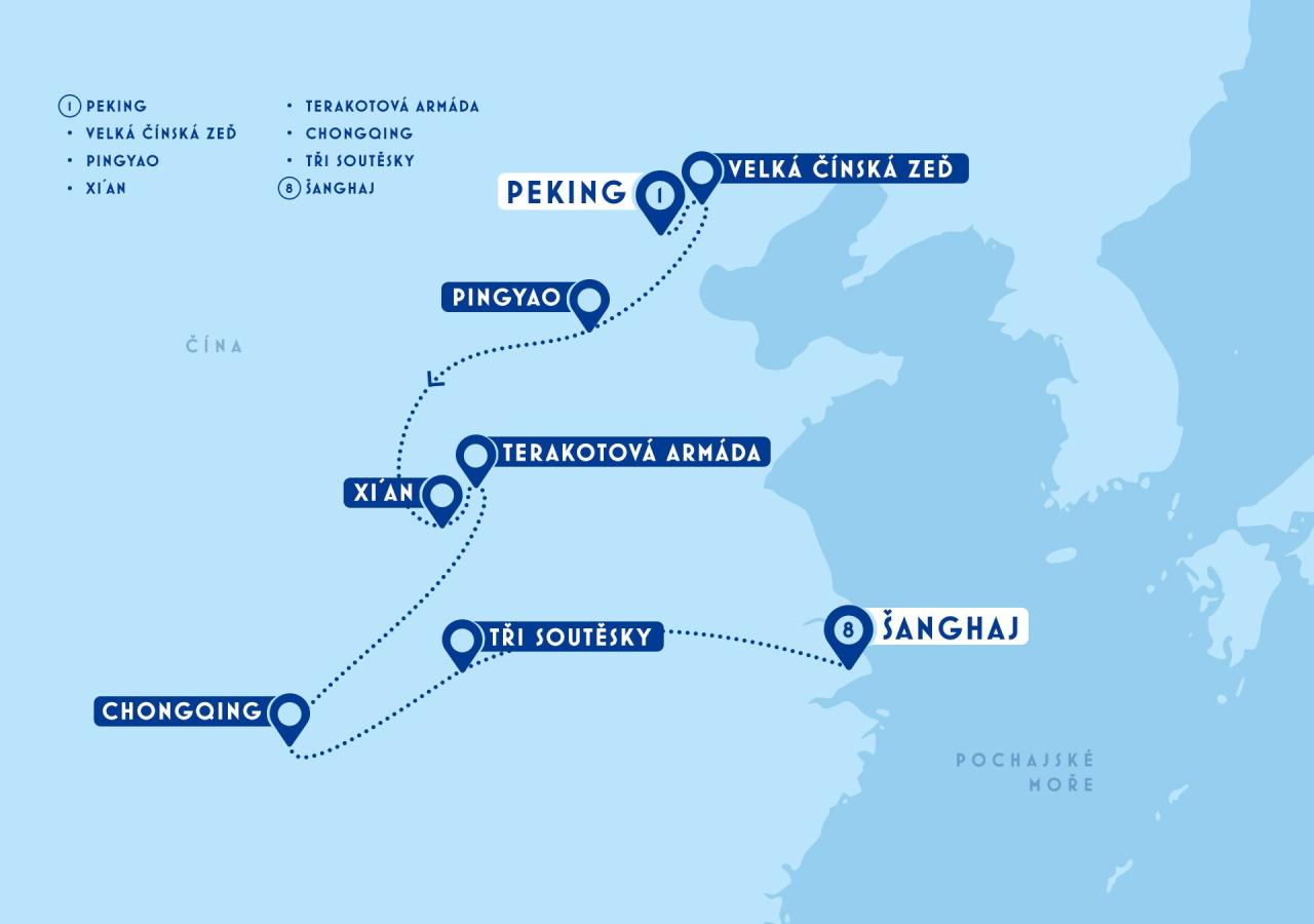 (vybrané termíny přímým letem) - hlavního města Číny. 2. den: Přílet do Pekingu, transfer do hotelu, ubytování. V odpoledních hodinách prohlídka Letního paláce ležícího na malebném jezeře uprostřed pahorků nedaleko hlavního města, kde můžeme obdivovat nejdelší dřevěný koridor na světě či zajímavou mramorovou loď císařovny Cchi´ Si. Návrat na hotel, večeře, nocleh. 3. den: Po snídani celodenní výlet na Velkou čínskou zeď - 10 000 li dlouhá stavba táhnoucí se od Žlutého moře až po průsmyk v poušti Gobi. Cestou do hotelu foto zastávka u národního stadionu Birdnest (Ptačí hnízdo) a Watercube (Vodní kostky) - obě stavby byly postaveny pro Letní olympijské hry v roce 2008. Návrat na ubytování, večeře, nocleh. 4. den: Po snídani prohlídka města zahrnující mj. Chrám nebes - vrcholné dílo dynastie Ming dokončené roku 1420 - místo setkávání nebe a země. Za návštěvu stojí např. Síň modliteb, Zeď ozvěn nebo Oltář Nebes. Náměstí Nebeského klidu - s rozlohou přes 40 hektarů - největší veřejné prostranství na světě. Komplex 800 budov a 9000 místností Zakázané město - Polední brána Wumen, brána nejvyšší harmonie Taihemen, slavnostní sály Taihedian, Zhonghedian a Baohedian, palác Nebeské čistoty Qianqinggong a mnoho dalšího. Večeře, nocleh v hotelu. 5. den: Po snídani přejezd vlakem do starého čínského města Pingyao, ubytování, prohlídka historického centra sevřeného impozantními hradbami. Součástí hradeb je opevněná pagoda Kuixing s prohnutou střechou. Městská věž poskytuje výhled na staré město, obrovský komplex konfuciánského chrámu z roku 1163, tradiční domky z 18. - 19. st. a první čínskou banku Rishengchang. Volno k individuální prohlídce města, večeře, nocleh v hotelu. 6. den: Po snídani návštěva rodinného sídla rodiny Wang připomínající pevnost. Za zdmi pevnosti o rozloze 25 hektarů se nachází nádvoří, uličky, zahrady, vítězné oblouky či síně v typickém stylu dynastie Qing. V odpoledních hodinách přejezd vlakem do Xi´anu, večeře, nocleh v hotelu v Xi´anu. 7. den: Po snídani návštěva jedné z největších atrakcí celé Číny - Terakotové armády. Hliněná armáda císaře Čchin Š´chuantiho objevená náhodně v roce 1974 místními rolníky. Více než 6000 ozbrojených bojovníků v životní velikosti rozestavěných v bojovém šiku. Odpoledne prohlídka města - Muslim Street s Velkou mešitou, Velká husí pagoda se svitky obsahující základy buddhismu, večeře, nocleh v hotelu. 8. den: Po snídani transfer na letiště a odlet do Chongqingu - tzv. Horského města díky své poloze mezi kopci. Návštěva Erlinova parku - původně soukromé zahrady zmiňované v mnoha čínských básních. Starobylá vesnice Ci Qi Kou - během dynastie Ming a Qing proslulá výrobou porcelánu. Večeře, volný čas k nákupům, večer odjezd do přístavu a nalodění na výletní plavbu lodí *****. Nocleh na lodi. 9. den: Snídaně na palubě. Jedinečná příležitost spojení odpočinku na lodi během plavby s možností pozorování nádherné okolní krajiny, různých aktivit např. masáže, tai chi, lekce kaligrafie… Návštěva hory Shuang Gui ve Fengdu. Hora se tyčí ve výšce 401 metrů nad mořem, místo je dodnes opředeno tajemnem. Roku 4 n.l. zde vznikly básně a historické legendy, dokonce se zde konala důležitá bitva čínské historie. Prohlídka místních chrámů a pavilonů. Návrat na loď, na palubě oběd, večeře na lodi, přehlídka tradičních kostýmů, nocleh na lodi. 10. den: Snídaně na palubě, plavba soutěskou Qutang - nejmenší a nejkratší, délka pouhých 8 km. Následuje druhá 40 km dlouhá soutěska Wu, jejíž až 1 km vysoké srázy tvoří nádhernou podívanou. Průjezd proudem bohyně Stream - přítokem řeky Jang-c'-ťiang. Během plavby probíhá doprovodný program na lodi, oběd a večeře na lodi, nocleh na lodi. 11. den: Snídaně na lodi, doplujeme k největší přehradě světa Tři soutěsky a k třetí největší soutěsce Xiling. Vylodění v přístavu Yichang a přejezd vlakem do Šanghaje. Transfer na hotel, nocleh. 12. den: Po snídani celodenní prohlídka Šanghaje - rušné třídy Nanjing s přilehlým nábřežím Bund, chrám Jadeitového Buddhy, Juanské zahrady - oázu zeleně přímo v centru města, kde poznáme nenapodobitelnou podobu čínských zahrad. Volno k nákupům a vlastnímu programu, fakultativně možnost zažít jízdu vznášejícím se vlakem Maglev train. Ve večerních hodinách transfer na letiště a odlet s přestupem do Prahy s přestupem v Šanghaji. 13. den: Přílet do Prahy v ranních hodinách. |