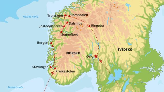 Bergen • Dalsniba • Cesta orlů • Geirangerfjord • Cesta Trollů •